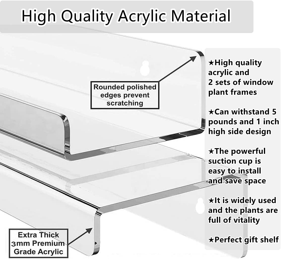 These 2-pack 15-inch acrylic window shelves are designed to bring both function and elegance to your home. Made from strong, 5mm thick transparent acrylic, they offer a long-lasting and modern solution for organizing your space. Each shelf features 3 suction cups for secure mounting and 2 extra cups included for replacements, ensuring a reliable and hassle-free setup. The minimalist design easily blends with any decor, and can be installed on windows, mirrors, or smooth tiles without damaging the surface. Whether you're a plant enthusiast or looking to streamline your home organization, these shelves are a perfect choice for small spaces and creative storage solutions.