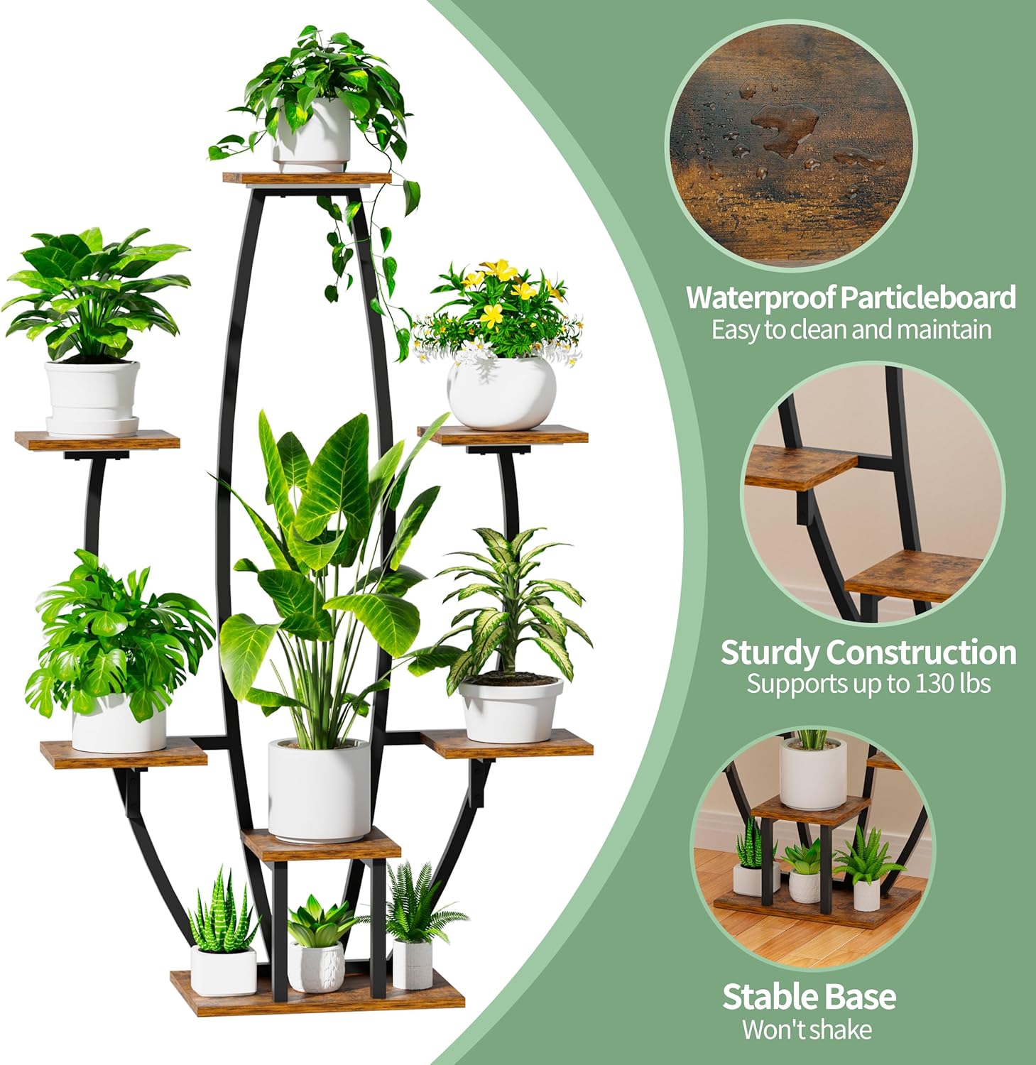 Constructed with thickened iron pipes and waterproof particleboards, this stand is durable and built for long-term use. Its stable base ensures your plants are secure and safe, while the easy-to-clean materials make upkeep a breeze.