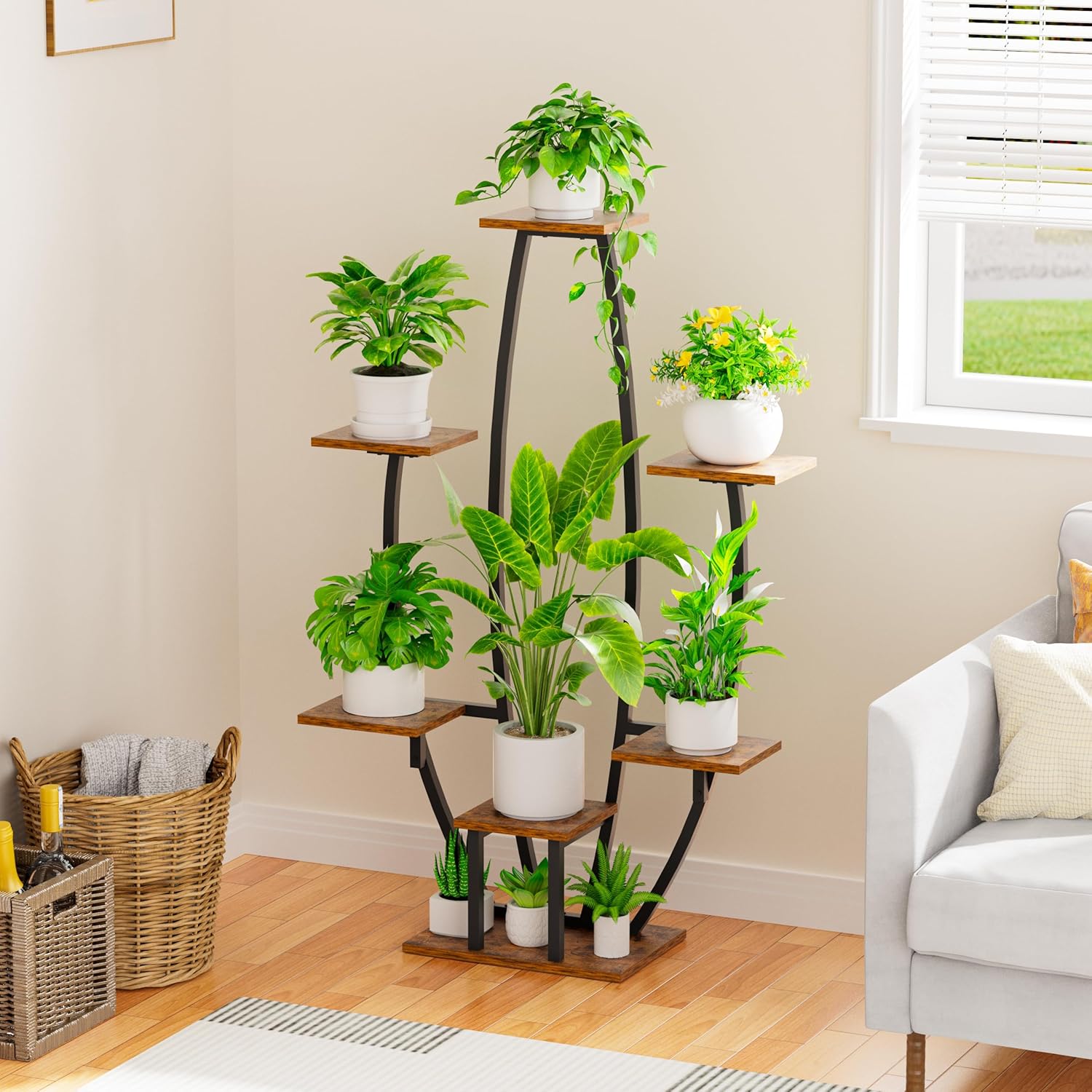 This 7-tiered plant stand offers maximum space for multiple pots, allowing you to create a lush, vibrant display without crowding your living area. Its compact footprint of 30" W x 12" D x 47" H ensures it fits easily into corners, making use of vertical space for both small apartments and larger homes.