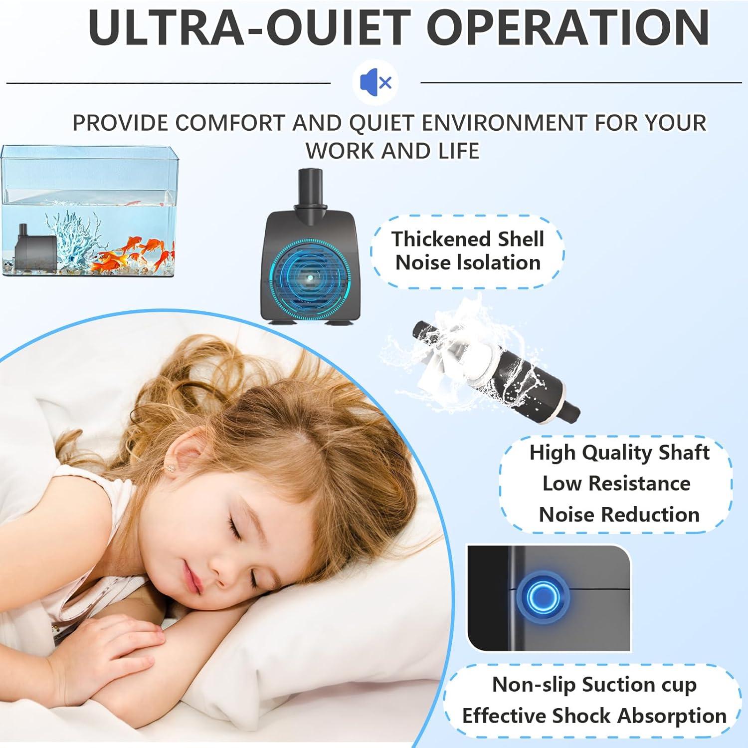 Equipped with a 5.2ft clear, flexible, and anti-deformation tubing, the pump is perfect for quick setup without the need for extra accessories. Its built-in pure copper motor delivers powerful water movement while maintaining a whisper-quiet operation, making it ideal for residential or outdoor spaces where silence is key.