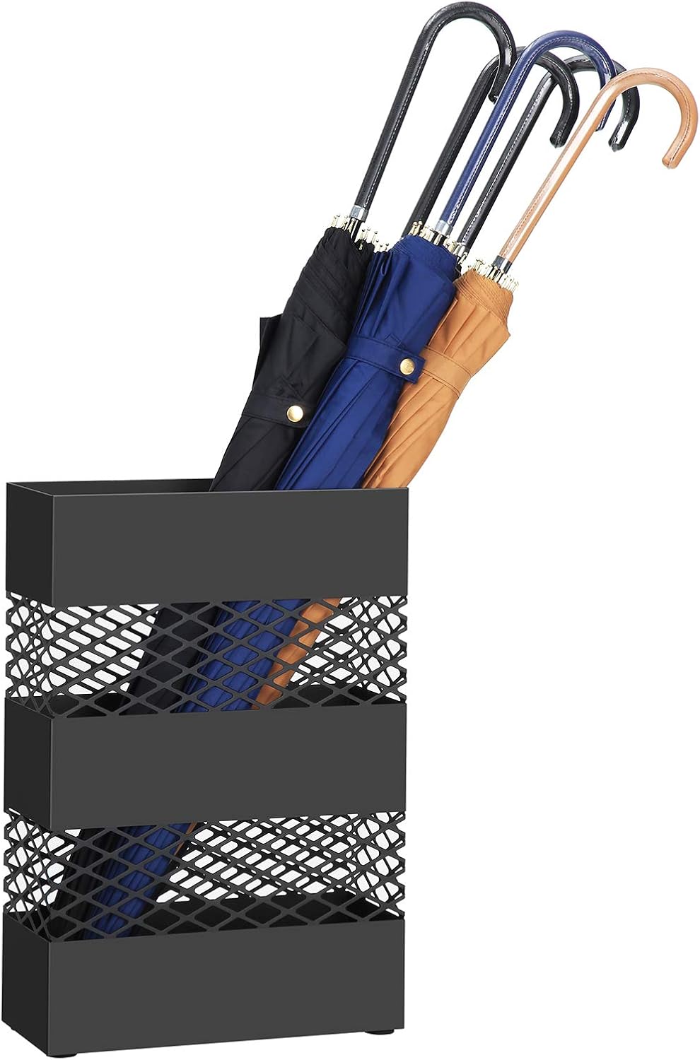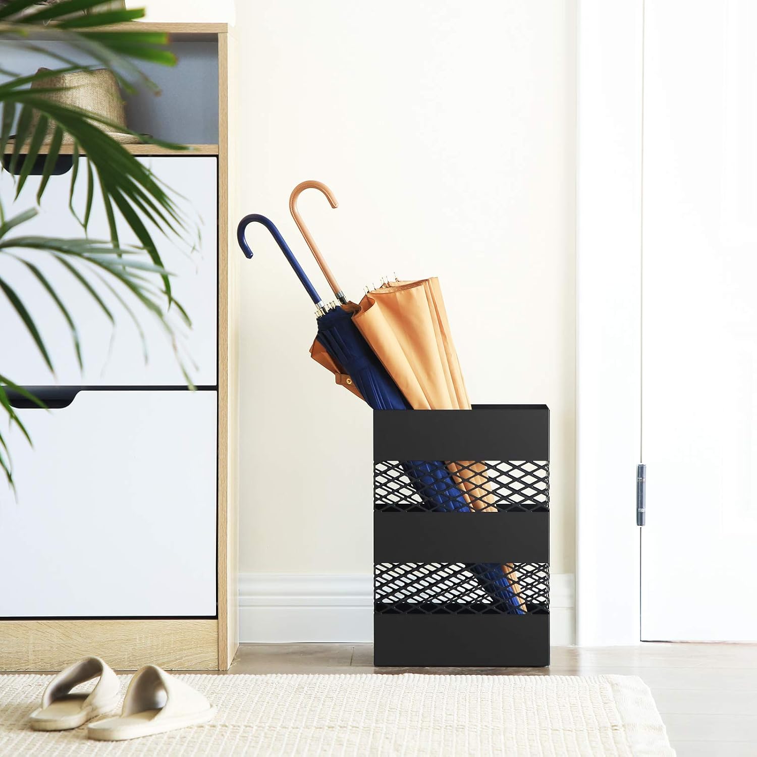 This SONGMICS umbrella stand combines strength with sophistication, making it the ultimate addition to any entryway. Crafted from high-quality steel, it offers exceptional durability, and its rust-resistant finish ensures it maintains its appearance over time. The openwork design adds an elegant touch to your space while promoting airflow, which helps your umbrellas dry quicker after use. With a built-in water tray, you can protect your floors from moisture and damage. The detachable plastic drip tray makes it simple to clean and maintain, giving you hassle-free care.